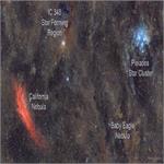 نامگذاری خوشه محو شده است. در سمت چپ پایین، که به رنگ قرمز می درخشد، سحابی کالیفرنیا