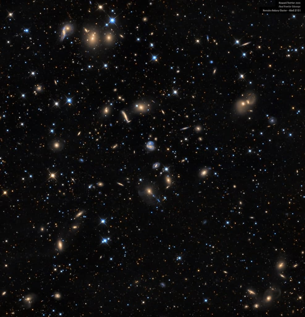 اینها کهکشانهای خوشه جاثی هستند، مجمع الجزایری که حدود 500 میلیون سال نوری از ما فاصله دارند. این خوشه که با نام آبل2151 نیز شناخته می شود، مملو از کهکشان های مارپیچی غنی از گاز و غبار است، اما کهکشان های بیضوی نسبتاً کمی دارد که فاقد گاز و گرد و غبار و در نتیجه ستاره های تازه متولد شده هستند. رنگها در این تصویر ترکیبی از عمق این منطقه به وضوح کهکشانهای ستاره ساز را به رنگ آبی و کهکشانهایی با جمعیت ستاره ای قدیمی تر را به رنگ زرد نشان می دهد. این تصویر واضح تقریباً 1/2 درجه از مرکز خوشه را شامل می شود که وسعتی بیش از 4 میلیون سال نوری را در بر می گیرد. پدیده پراش اطراف ستاره های پیش زمینه درخشان تر مربوط به کهکشان راه شیری ما بوده و توسط تیغه های نگهدارنده آینه تلسکوپ تولید می شوند. به نظر می رسد در این نمای کیهانی بسیاری از کهکشان ها با یکدیگر برخورد می کنند یا در هم می آمیزند و بعضی دیگر نیز تغییر شکل یافته اند که شاهدی واضح برای این مساله است که کهکشان ها در خوشه های کهکشانی معمولاً با یکدیگر تعامل دارند. در حقیقت، خوشه جاثی ممکن است در نتیجه ادغام مداوم خوشه های کهکشانی کوچکتر به وجود آمده باشد و تصور می شود که شبیه خوشه های کهکشانی جوان در فواصل بسیار دورتر و در اوایل تشکیل جهان باشد.