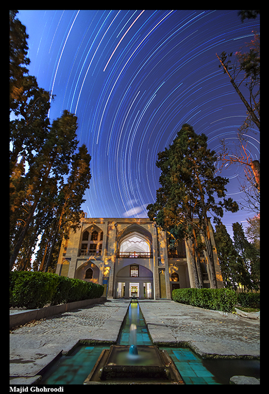 رد نور ستارگان دور قطبی به مدت 4 ساعت و 45 دقیقه در باغ تاریخی فین کاشان زیر نور ماه شب 11