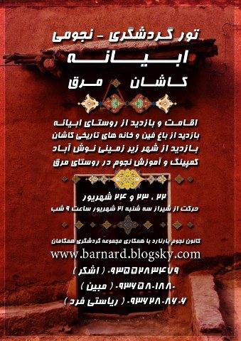 این بار کانون نجوم بارنارد با همکاری مجموعه گردشگری همگامان در نظر دارد در تاریخ 22 لغایت 24 شهریورماه تور گردشگری - نجومی در روستای ابیانه ، کاشان و روستای مرق برگزار کند.