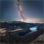 Explanation: You have to take a long hike to see the Troll's Tongue -- ten hours over rocky terrain. And in this case, it took three trips to capture the landform below a clear night sky. Trolltunga itself is a picturesque rock protrusion extending about 700 meters over mountainous cliffs near Lake Ringedalsvatnet in Norway. The overhang is made of billion-year-old Precambrian bedrock that was carved out by glaciers during an ice-age about 10,000 years ago. The featured picture is a composite of two exposures, a 15-second image of the foreground Earth followed 40 minutes later by an 87-second exposure of the background sky. Thousands of discernable stars dot the backdrop starscape in addition to billions of unresolved stars in the nearly vertical band of our Milky Way Galaxy.