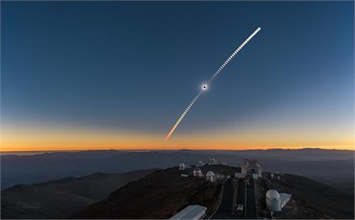 Explanation: The road to the high mountaintop La Silla Observatory in the Chilean Atacama Desert also led to totality in the path of July 2nd's total solar eclipse. This regular eclipse sequence is centered near the moment the Moon's dark shadow fell across some of planet Earth's large telescopes. In fact La Silla was a little north of the shadow track's center line. The region's stunning, clear skies are slightly brighter to the north (right) in the scene. The dreamlike view looks west toward the setting Sun and the approaching shadow path.